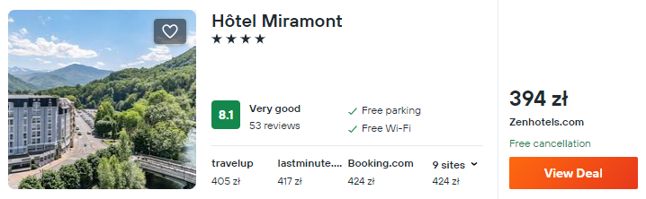 W Lourdes rozważ pobyt w bardzo dobrym 4* hotelu Miramont, który będzie świetną bazą wypadową w Pireneje.