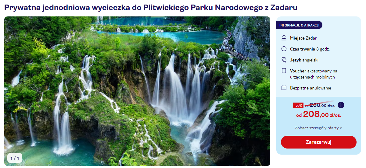 Będąc w Zadarze nie możesz ominąć wspaniałego Parku Narodowego Jezior Plitwickich! Tutaj możesz zarezerwować wycieczkę z wyprzedzeniem.