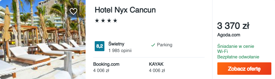 Lubicie luksusy? Urlop spędźcie w Cancun, gdzie zatrzymacie się w 4* hotelu Nyx, który oferuje komfortowe, klimatyzowane pokoje wyposażone w Wi-Fi. Obiekt wyróżnia się świetnymi opiniami m.in. ze względu na swój basen, taras i bezpośrednie sąsiedztwo plaży. Co więcej, w cenę pobytu wliczono smaczne śniadania.