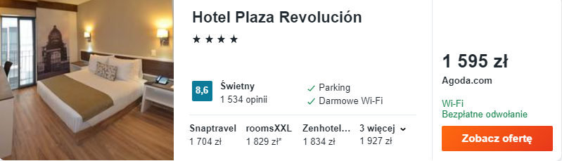Na miejscu wybrałem dla was zakwaterowanie w bardzo dobrze ocenianym 4* hotelu Plaza Revolucion. Będzie to dobre miejsce na wypoczynek oraz korzystna baza wypadowa do odkrywania uroków miasta.