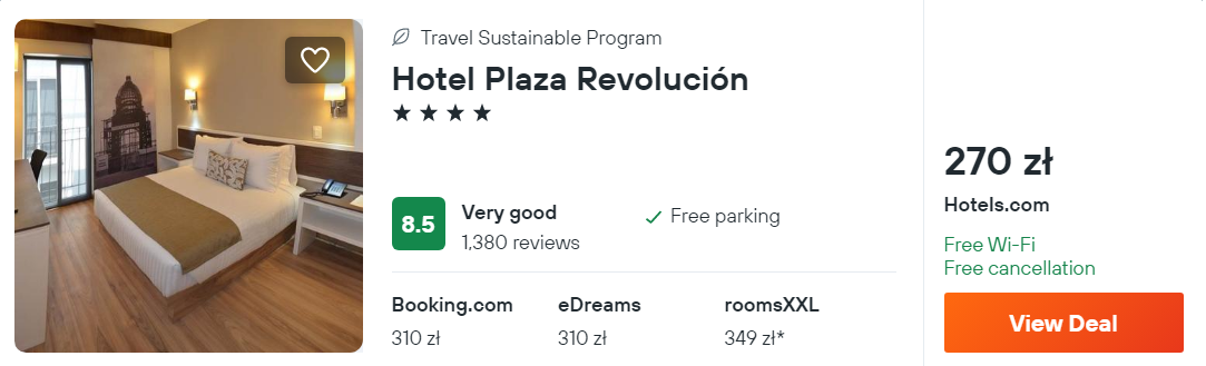 W mieście Meksyk rekomenduję 4* hotel Plaza Revolucion. Do twojej dyspozycji zostanie oddany pokój z prywatną łazienką i dostępem do WiFi.