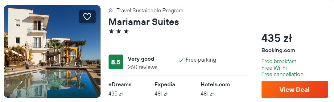 Natomiast w San Jose del Cabo polecam 3* hotel Mariamar Suites. Na miejscu znajdziesz basen zewnętrzny, taras słoneczny i pokój z prywatną łazienką. W cenę noclegów wliczono śniadania.