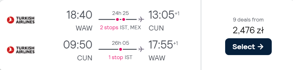 Twój wyjazd rozpocznie się 13 lutego przelotem z lotniska w Warszawie do Cancun. Podróżować będziesz na pokładzie samolotu linii lotniczej Turkish Airlines z przesiadką w Stambule. Do stolicy wrócisz 29 lutego.