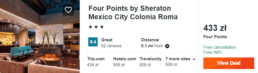 W stolicy Meksyku proponuję wam noclegi w 4* hotelu Four Points by Sheraton Mexico City Colonia Roma, który znajduje się nieopodal ścisłego centrum miasta. Wszystkie pokoje są klimatyzowane i posiadają łazienkę z wanną i prysznicem. Na miejscu będziecie mieli zapewniony bezpłatny parking oraz dostęp do sieci WiFi.
