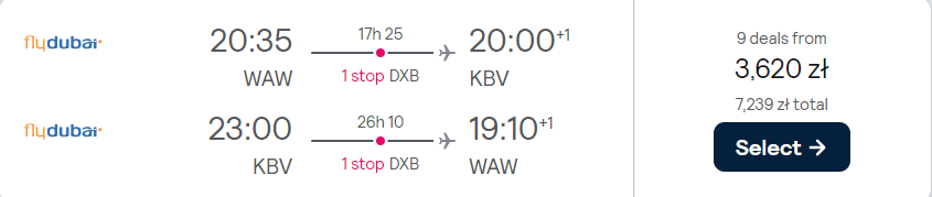 Do Bangkoku udasz się z lotniska w Warszawie w terminie 13 (14) listopada – 13 (14) grudnia. W obie strony podróżować będziesz na pokładach samolotów linii Flydubai z przesiadkami na lotnisku w Dubaju. Bez dodatkowych kosztów zabrać możesz bagaż podręczny.