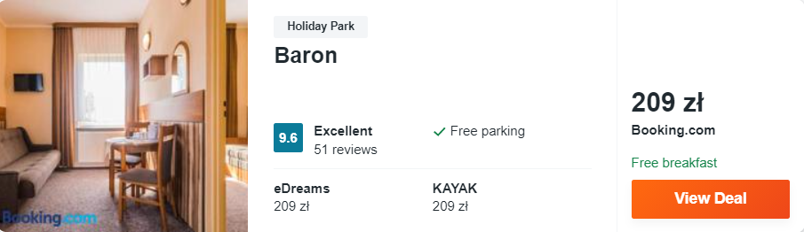Wszystkie poniższe obiekty oferują pobyty w dogodnych warunkach z dostępem do m.in. krytego basenu, centrum fitness oraz sieci WiFi. Niektóre z nich zapewniają także plac zabaw dla najmłodszych oraz codzienne śniadania. W każdym pokoju na wyposażeniu znajdziecie telewizor LCD, zestaw do parzenia kawy lub herbaty oraz grzejnik – w łazience zastaniecie m.in. suszarkę do włosów oraz wannę lub prysznic.