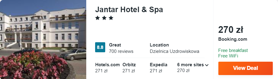Dowiedzcie się więcej o tym hoteluKolejnym hotelem zapewniającym codzienne śniadania w cenie jest 3* Jantar Hotel & Spa. Obiekt od plaży w Kołobrzegu oddalony jest o 150 metrów, od mola o 500 metrów a od portu o 800 metrów. Do centrum miasta dojdziecie spacerem w nieco ponad 20 minut.