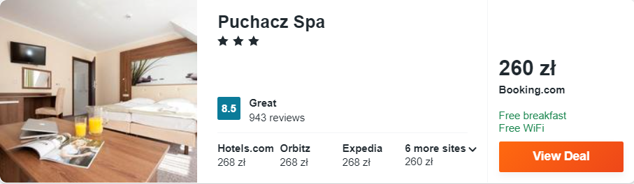 Dowiedzcie się więcej o tym hoteluWybierając pobyt w 3* hotelu Puchacz Spa, zakwaterowani będziecie w sąsiedztwie plaży w Niechorzu oraz jeziora Liwia Łuża. W cenę wliczone są codzienne śniadania, a goście bezpłatnie mogą korzystać ze sprzętu plażowego (leżaki, parawany i parasole przeciwsłoneczne).