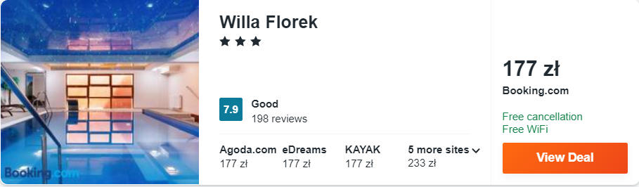 Dowiedzcie się więcej o tym hoteluTylko 2 PLN/doba więcej zapłacicie za pobyt w 3* Willi Florek. Znajduje się ona w odległości 600 metrów od plaży w Rewalu, a tuż przy wejściu nr 24 mieści się 12-metrowy taras, z którego roztacza się malowniczy widok okolicę. Na terenie kompleksu jest plac zabaw dla dzieci, a goście mogą korzystać z ogólnodostępnego sprzętu do grillowania.