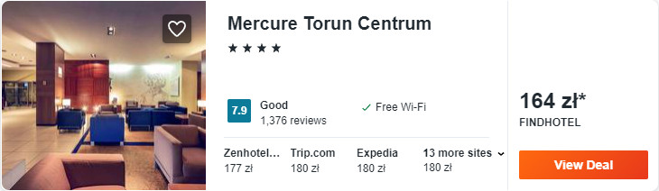 Dla miłośników słodkości – królestwo pierników! 4* hotel Mercure Toruń Centrum usytuowany jest zaledwie 15 minut spacerem od zabytkowego starego miasta. Każdy klimatyzowany pokój wyposażony jest w minibar, WiFi, telewizor i prywatną łazienkę z bezpłatnym zestawem kosmetyków. Na miejscu znajduje się centrum fitness oraz restauracja Winestone serwująca dania kuchni polskiej i międzynarodowej.