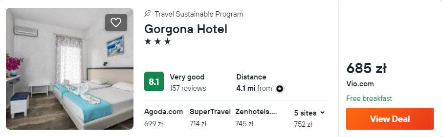 W Heraklionie zatrzymasz się w 3* hotelu Gorgona, który znajduje się w odległości 150 metrów od plaży Ammoudara. Z lotniska w okolice miejsca noclegowego (przystanek Bali) dojedziesz autobusem lub wypożyczonym samochodem – szczegóły znajdziesz poniżej.