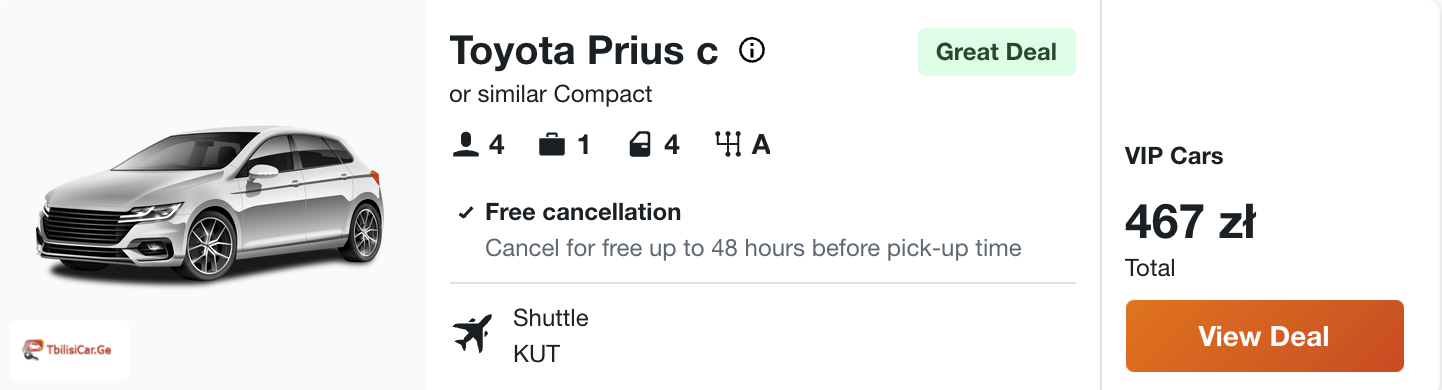 Na lotnisku w Kutaisi wynajmijcie samochód, który pomoże wam dostać się do ośrodka narciarskiego w Gudauri. Za wypożyczenie Toyoty Prius c (lub podobnego modelu) na czas waszego pobytu zapłacicie w sumie 467 PLN.
