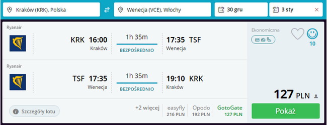 Kliknij i zarezerwuj loty z Krakowa do Wenecji i z powrotem: