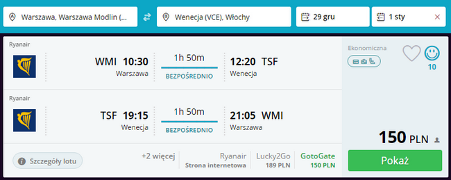 Kliknij i zarezerwuj loty z Warszawy Modlin do Wenecji i z powrotem: