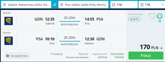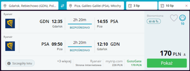 Okazja na niedrogie, wakacyjne loty do malowniczej Toskanii. Podróż do Pizy zarezerwujecie za 170 PLN. Toskania leży w centralnej części Włoch, u wybrzeża Morza Tyrreńskiego. Graniczy z Emilią Romanią, Ligurią, Umbrią, Marche i Lacjum. Dominuje tutaj krajobraz wyżynny. To region niesamowicie malowniczy, porośnięte bujną roślinnością góry, doliny, w których kryją się urokliwe, odcięte od świata miasteczka. Regionalna kuchnia i wina cieszą się dużą popularnością, a szeroko rozwinięta agroturystyka dysponuje bogatą bazą noclegową.