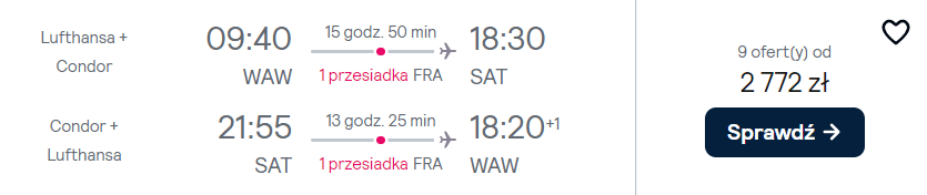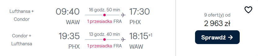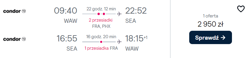 Na każdej trasie polecisz PLL LOT lub Lufthansą oraz Condorem, z wygodnymi przesiadkami we Frankfurcie i jednej w Phoenix (loty do Portland i Seattle). W cenę biletu wliczony jest bagaż rejestrowany (nadawany do luku) oraz podręczny.