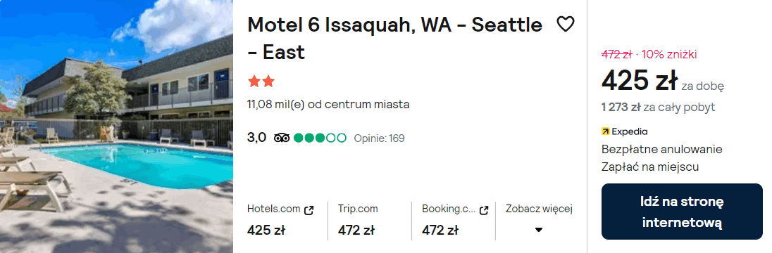Nieopodal Seattle proponuję ci noclegi w obiekcie Motel 6 Issaquah, który oddalony jest o 15 minut jazdy samochodem od miejscowości Snoqualmie, w której kręcono serial ,,Miasteczko Twin Peaks”! Na terenie obiektu znajduje się odkryty basen oraz bezpłatny parking.