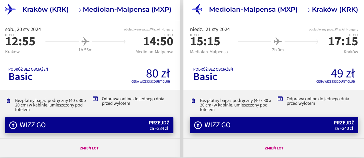 Do Lombardii udasz się w terminie 20-21 stycznia (sobota-niedziela) z krakowskiego lotniska w Balicach. W obie strony polecisz na pokładach samolotów linii Wizz Air. Bez dodatkowych kosztów możesz zabrać ze sobą sam bagaż podręczny.