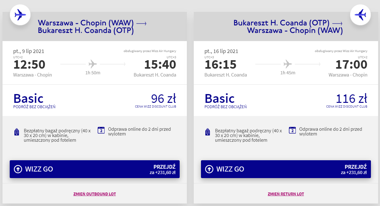 Do Bukaresztu udacie się z warszawskiego lotniska w terminie 9 – 16 lipca na pokładzie samolotów linii Wizz Air. Pamiętajcie, że najtaniej bilety kupią członkowie Wizz Discount Club – pozostali chętni na taką podróż zapłacą nieco więcej. Bez dodatkowych kosztów do Rumunii polecicie z bagażem podręcznym.
