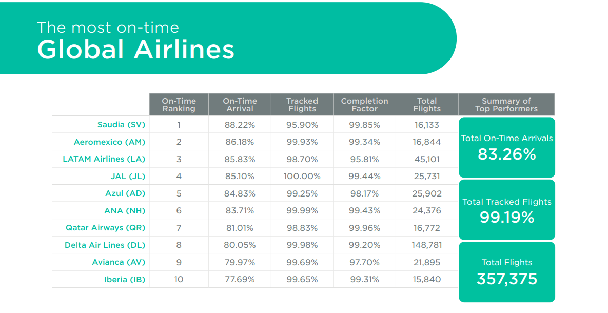 Nic więc dziwnego, że najnowszy globalny ranking punktualności – przygotowany tradycyjnie przez firmę analityczną Cirium – w czerwcu przynosi wiele zmian. Najlepszą – pod względem punktualności – tradycyjną linią lotniczą na świecie okazała się być Saudia. Narodowy przewoźnik Arabii Saudyjskiej może pochwalić się wynikiem na poziomie 88,22% punktualnych lotów. Drugie miejsce przypadło Aeromexico, które sięgnęło pułapu 86,18% punktualnych operacji. Podium zamyka LATAM – z wynikiem 85,83%, a pierwszą piątkę kolejno JAL – 85,10% i Azul – 84,83%. W pierwszej dziesiątce znalazło się miejsce jeszcze dla linii ANA, Qatar Airways, Delta, Avianca i Iberia.