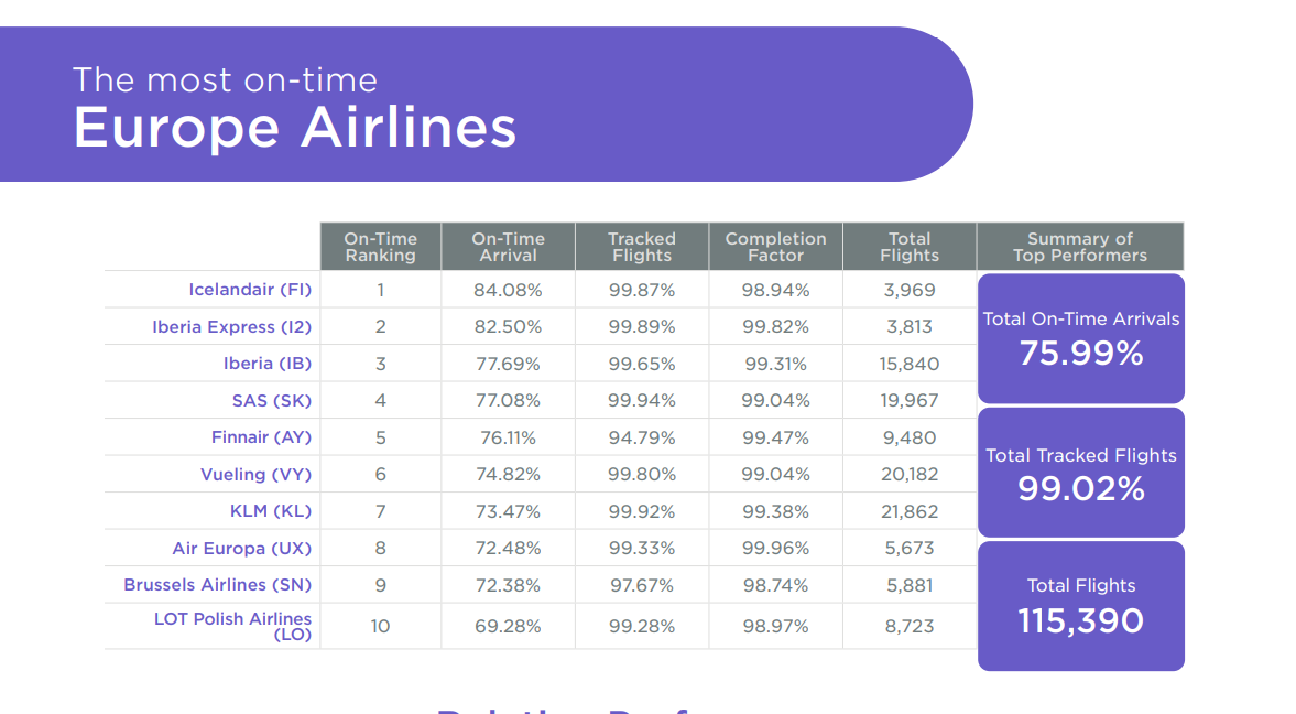 Co ciekawe, w osobnej kategorii dla Europy (która uwzględnia zarówno tanie linie, jak i tradycyjnych przewoźników), Iberia spada na trzecie miejsce. Wyprzedza ją bowiem Icelandair (84.08% punktualnych lotów) i Iberia Express (82.50%). Zaraz za podium mamy natomiast SAS i Finnair. Dziesiątkę najlepszych zamykają kolejno Vueling, KLM, Air Europa, Brussels Airlines i… LOT.