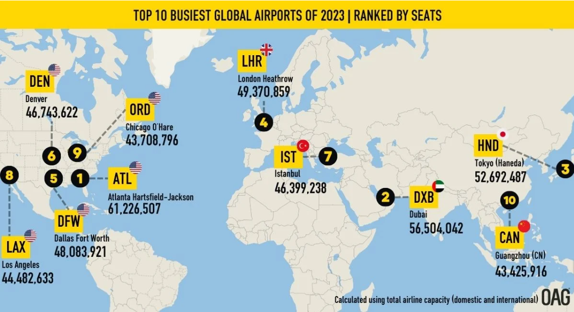 Na drugiej lokacie znalazło się lotnisko w Dubaju, w przypadku którego całkowita liczba miejsc w samolotach odlatujących wyniosła 56,5 mln, a trzeci był port w Tokio (Haneda) z wynikiem 52,7 mln. Pierwsze europejskie lotnisko do londyńskie Heathrow – zajęło czwarte miejsce z wynikiem niespełna 49,4 mln.