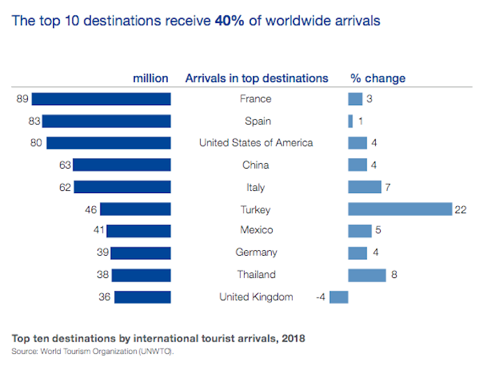 Ale różnic między oboma rankingami jest więcej – na siódmym miejscu w zestawieniu najlepiej zarabiających krajów znajduje się Australia (45 mld USD przychodów z turystyki w 2018 roku). Wynika to przede wszystkim z wysokich cen na miejscu, które sprawiają, że chcąc nie chcąc, wydajemy więcej.