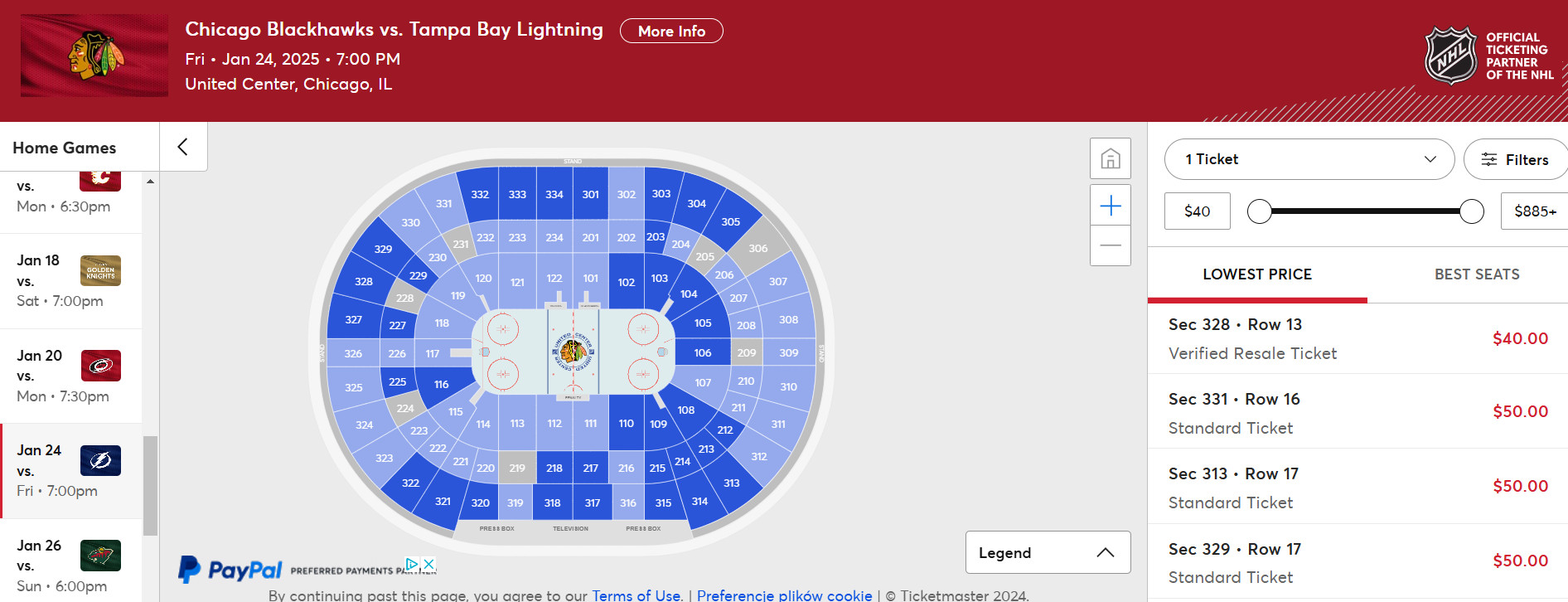 Na pierwszy mecz udasz się 24 stycznia do hali United Center, gdzie o godzinie 19:00 rozpocznie się spotkanie NBA pomiędzy drużynami Chicago Blackhawks a Tampa Bay Lightning. Ceny najtańszych biletów zaczynają się od 40 USD (ok. 167 PLN). Wejściówkę kupisz za pośrednictwem strony ticketmaster.com.