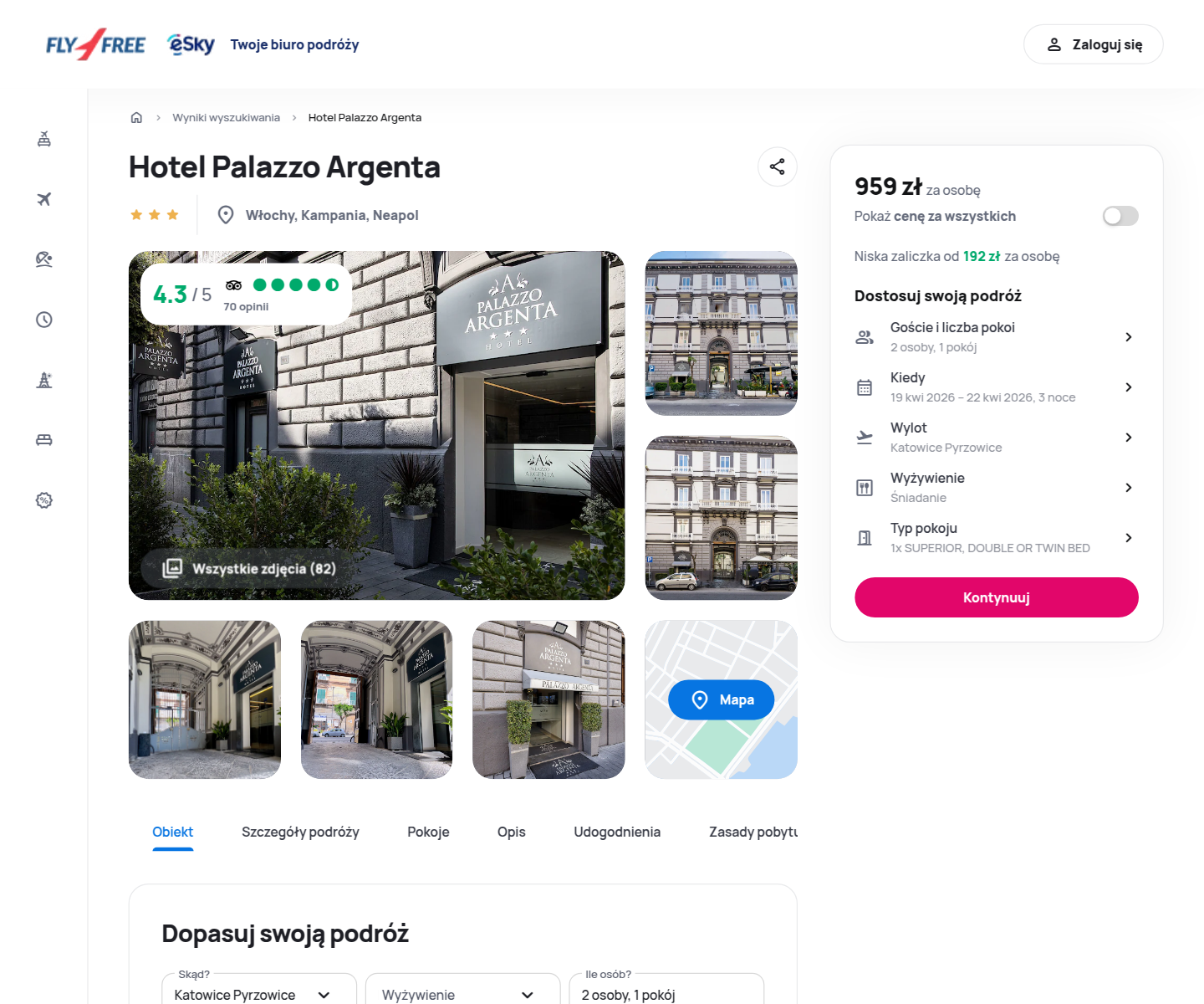 W Neapolu zatrzymasz się w 3* hotelu Palazzo Argenta, zaledwie 2 km od lotniska. Goście chwalą nowoczesne wnętrza, dźwiękoszczelne pokoje i doskonałą lokalizację. Obiekt oferuje klimatyzowane pokoje z telewizorami Smart, prywatne łazienki z bezpłatnymi kosmetykami oraz bar na miejscu. Stąd blisko do głównych atrakcji miasta: Neapolitańskiego Muzeum Archeologicznego, Castel Nuovo czy słynnej ulicy Via Toledo. Na dobry początek dnia otrzymasz pyszne śniadanie wliczone w cenę pobytu.