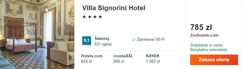 Na okolicy wybrałem dla was zakwaterowanie w wyjątkowym miejscu: 4* hotel Villa Signorini znajduje się w zabytkowej XVIII-wiecznej willi. Będzie to idealne miejsce, by poczuć wspaniały klimat południowych Włoch, dodatkowo otrzymacie śniadania wliczone w cenę noclegów.