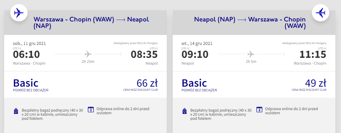 W podróż do Włoch wybierzecie się w dogodnym terminie obejmującym weekend: 11 – 14 grudnia. Czeka was bezpośrednia podróż z Warszawy do Neapolu, realizowana na pokładzie samolotu linii lotniczej Wizz Air