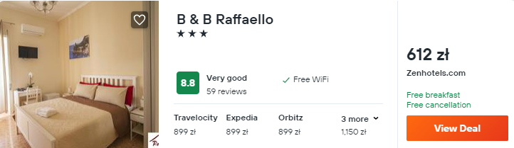 Wybrałem dla was noclegi w bardzo dobrze ocenianym pensjonacie B&B Raffaello. Na dobry początek dnia otrzymacie tam pyszne śniadanie wliczone w cenę zakwaterowania. Będzie to świetna baza wypadowa do wycieczek po okolicy – na przykład jeżeli chcielibyście odwiedzić Pompeje.