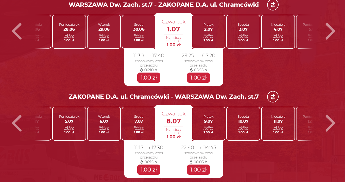 NEOBUS otworzył kalendarz rezerwacji na wakacje i udostępnił największą w historii pulę 400 tys. tanich biletów. Skorzystajcie z doskonałych cen i rezerwujcie wyjazdy np. do Ustrzyk, Polańczyka, Sanoka czy Zakopanego już od 1 PLN (+1 PLN opłaty za rezerwację).
