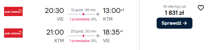 Do Katmandu polecisz z Wiednia z Air India. Po drodze przesiądziesz się w Nowym Delhi. W cenę biletu wliczony jest bagaż podręczny oraz rejestrowany.