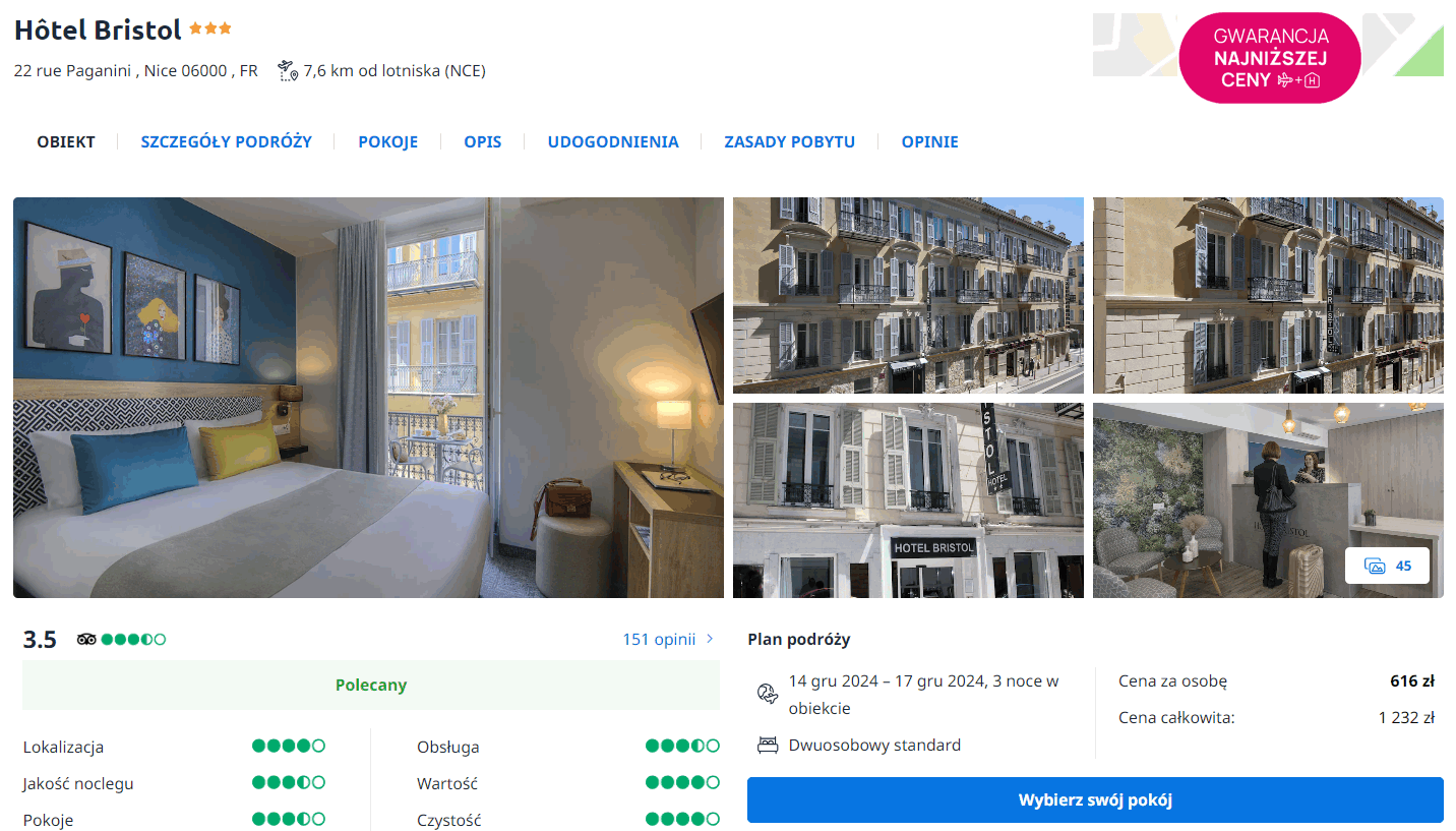 We Francji zatrzymasz się w 3* hotelu Bristol, który znajduje się w sąsiedztwie dworca kolejowego, a od słynnej promenada Anglików oddalony jest o niespełna 1 km. Każdy pokój wyposażony jest w klimatyzację z funkcją ogrzewania, telewizor LCD oraz minbar. W łazience jest prysznic, suszarka do włosów oraz podstawowe przybory toaletowe. Na terenie całego obiektu będziesz miał zapewniony dostęp do sieci WiFi.