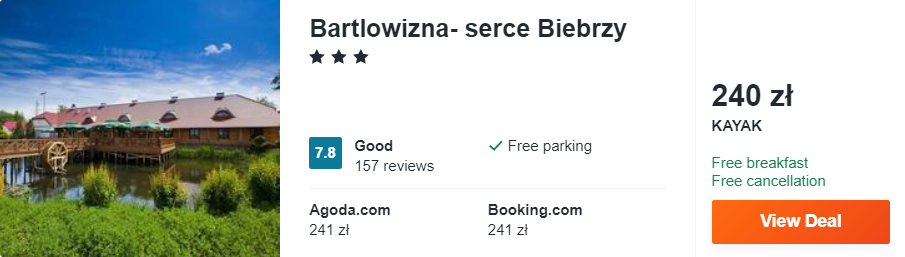 Dowiedzcie się więcej o tym hoteluOśrodek wypoczynkowy Bartlowizna Serce Biebrzy położony jest w sercu Biebrzańskiego Parku Narodowego nad brzegiem rzeki Biebrza! W cenę zakwaterowania wliczone są codzienne śniadania, a na miejscu goście mogą korzystać z darmowego parkingu oraz bezprzewodowego dostępu do internetu.