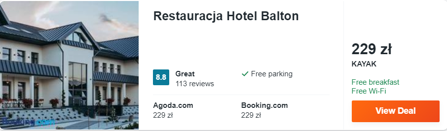 Dowiedzcie się więcej o tym hoteluZatrzymując się w fantastycznym hotelu – restauracji Balton w cenie pobytu zapewnione będziecie mieli codzienne śniadania. Obiekt znajduje się w Grajewie, a od Biebrzańskiego Parku Narodowego oddalony jest o nieco ponad 20 km. Trasę tę pokonacie autem w niecałe 20 minut.