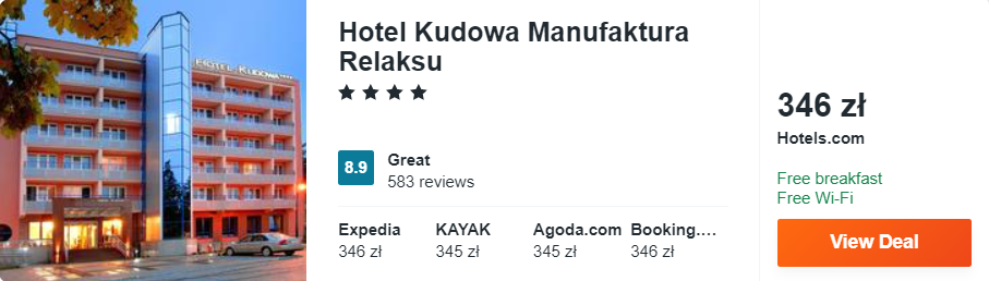 Dowiedzcie się więcej o tym hoteluNowoczesny 4* hotel Kudowa Manufaktura Relaksu mieści się w Kudowej-Zdroju, w pobliżu granicy polsko-czeskiej. Na miejscu goście zapewniony mają darmowy dostęp do sieci WiFi oraz bez dodatkowych kosztów mogą korzystać z krytego basenu i saun: suchej i parowej.