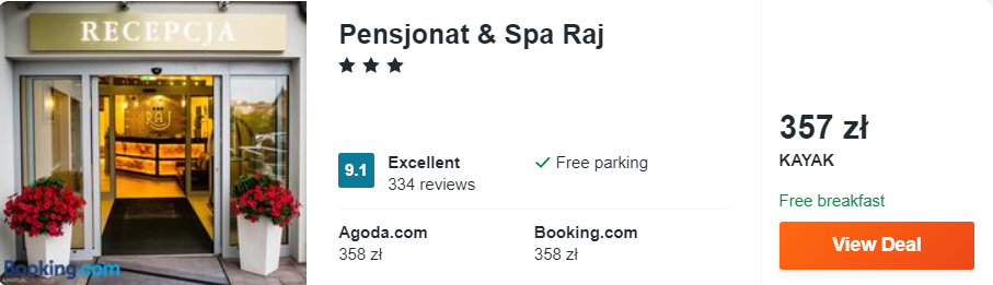 Dowiedzcie się więcej o tym hoteluZ gór nad jeziora: znakomity 3* pensjonat & Spa Raj położony jest u podnóża góry zamkowej, nad brzegiem jeziora Rajgrodzkiego. Obiekt swoim gościom zapewnia dostęp do prywatnej plaży oraz codzienne śniadania, które wliczone są w cenę zakwaterowania. Ponadto kompleks graniczy z jednym z najdzikszych w Polsce terenów – bagnami biebrzańskimi!