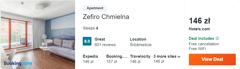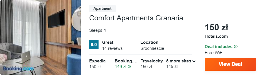 Dowiedzcie się więcej o tym hoteluTakże w Gdańsku znajduje się kolejny obiekt na mojej liście – Comfort Apartments Granaria. Położony jest on nad brzegiem Motławy, a z jego okien roztacza się widok na rzekę. Na Długi Targ dotrzecie w niecałe 5 minut spacerem.
