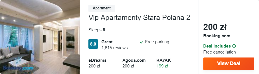 Dowiedzcie się więcej o tym hoteluPrzenosimy się od razu na południe kraju, a dokładniej do stolicy polskich gór. Kompleks VIP Apartamenty Stara Polana 2 oddalony jest od centrum Zakopanego o 600 metrów, a na słynne Krupówki oraz pod dolną stację na Gubałówkę dotrzecie w niecałe 15 minut spacerem.