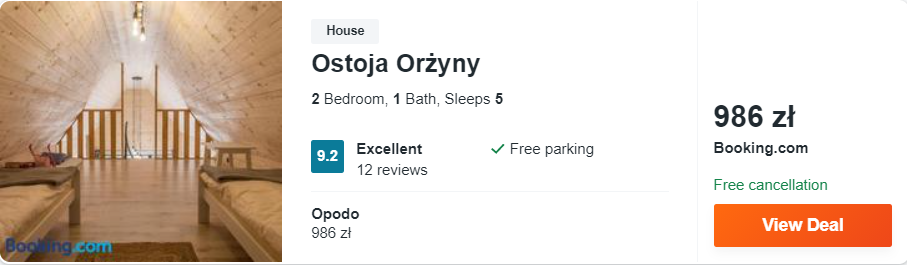 Dowiedzcie się więcej o tym hoteluA co powiecie na Mazury? Jeżeli interesuje was wypoczynek w Krainie Tysiąca Jezior, to skorzystajcie oferty pobytu w domku Ostoja Orżyny. Znajduje się on pośród lasu, we wsi Orzyny, w sąsiedztwie jezior Łęsk oraz Arwin. Najbliższe większe miasto (Szczytno) oddalone jest od obiektu o 14 km.