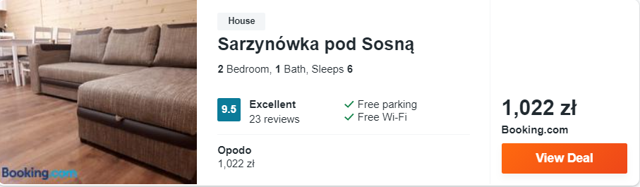 Dowiedzcie się więcej o tym hoteluOstatnim obiektem, w którym proponuję wam spędzić trochę czasu, jest domek Sarzynówka pod Sosną. Znajduje się on w bliskim sąsiedztwie rezerwatu przyrody Święty Roch, w miejscowości Krasnobród (woj. Lubelskie). Na miejscu znajduje się sporych rozmiarów ogród, bezpłatny parking oraz murowany grill.