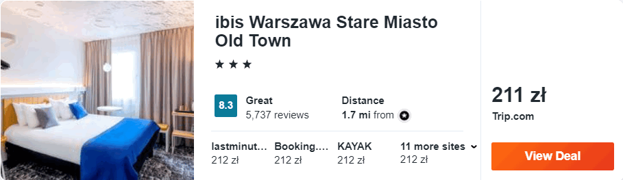 Dowiedzcie się więcej o tym hoteluTyle samo zapłacicie, decydując się na pobyt w 3* ibis Warszawa Stare Miasto Old Town. Hotel znajduje się w odległości 10 minut spokojnego spaceru od warszawskiej starówki. W każdym pokoju mieści się łazienka z prysznicem i suszarką do włosów.