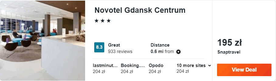 Dowiedzcie się więcej o tym hoteluW Gdańsku wybrałem dla was ofertę pobytu 3* hotelu Novotel Gdańsk Centrum, który od starego miasta oddalony jest o jedyne 200 metrów. Wszystkie pokoje zostały urządzone w nowoczesnym stylu i wyposażone w liczne udogodnienia. W każdym jest także łazienka z prysznicem.