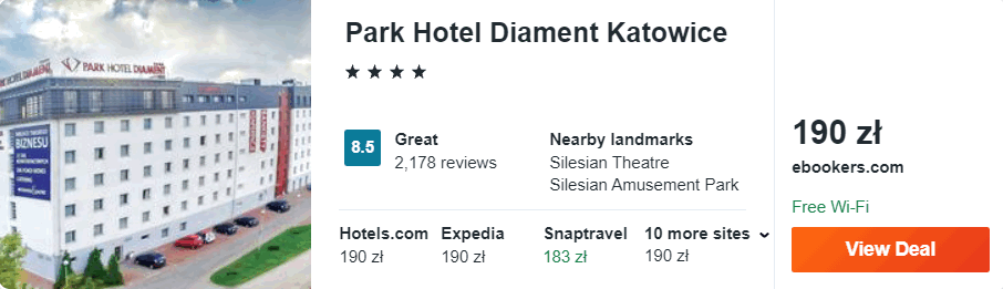 Dowiedzcie się więcej o tym hoteluNatomiast na Górnym Śląsku zatrzymajcie się w stolicy województwa, w 4* Park Hotel Diament Katowice. Ten bardzo dobry hotel znajduje się w bliskim sąsiedztwie parku im. Tadeusza Kościuszki oraz niepodal Archikatedry Chrystusa Króla. Na terenie obiektu zapewiony będziecie mieli dostęp do sieci WiFi oraz centrum fitness z sauną.