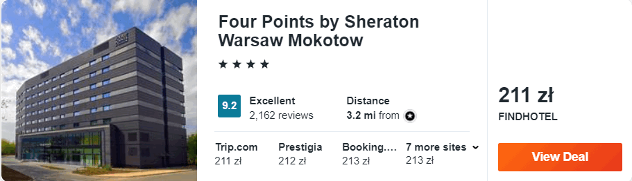 Dowiedzcie się więcej o tym hoteluW Warszawie proponuję wam noclegi w znakomitym 4* Four Points by Sheraton Warsaw Mokotów. Do hotelowych udogodnień należą m.in. doskonale wyposażone centrum fitness, sauna oraz bar, w którym podawane są piwa rzemieślnicze. Wszystkie pokoje zostały gustownie urządzone i wyposażone w klimatyzację, telewizor LCD oraz czajnik elektryczny.