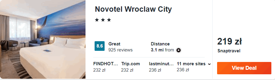 Dowiedzcie się więcej o tym hoteluW stolicy Dolnego Śląska wybrałem dla was pobyt w 3* hotelu Novotel Wrocław City, który znajduje się w spokojnej, zielonej części Wrocławia. Na miejscu zapewniony będziecie mieli dostęp do dobrze wyposażonego centrum fitness oraz sieci WiFi.