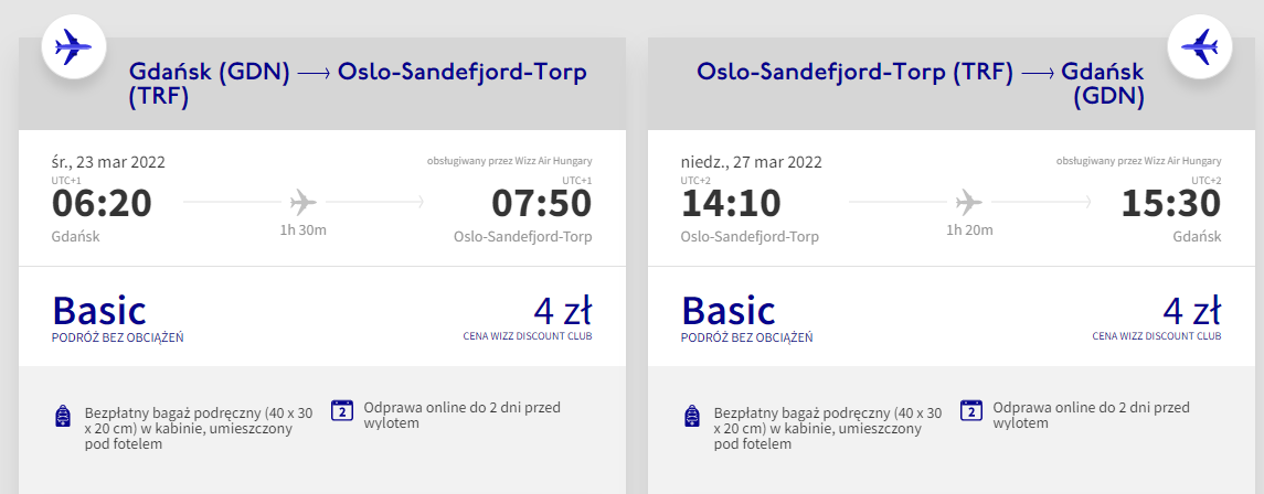 Bilety w tak niskiej cenie zarezerwujecie decydując się na podróż Sandefjord, będącego jednym z lotnisk obsługujących stołeczne Oslo. Czeka was podróż z Gdańska, realizowana na pokładzie samolotu linii lotniczej Wizz Air.