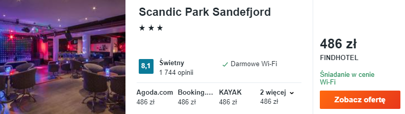 W Norwegii polecam zatrzymać się w 3* hotelu Scandic Park Sandefjord. W cenę zakwaterowania wliczone są śniadania.